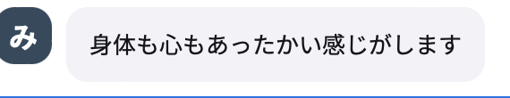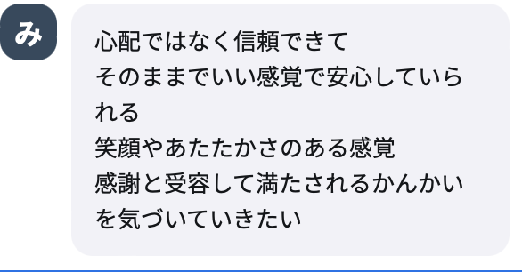 最初のワークで、いつも感じている感情と、親に感じている感情がほぼ(というか全部?)一緒だったことや、穏やかな感情を、ほとんど感じられてないことに気づき、びっくりしました。 いつも安心できずに張り詰めてたんだな、私。って思いました。